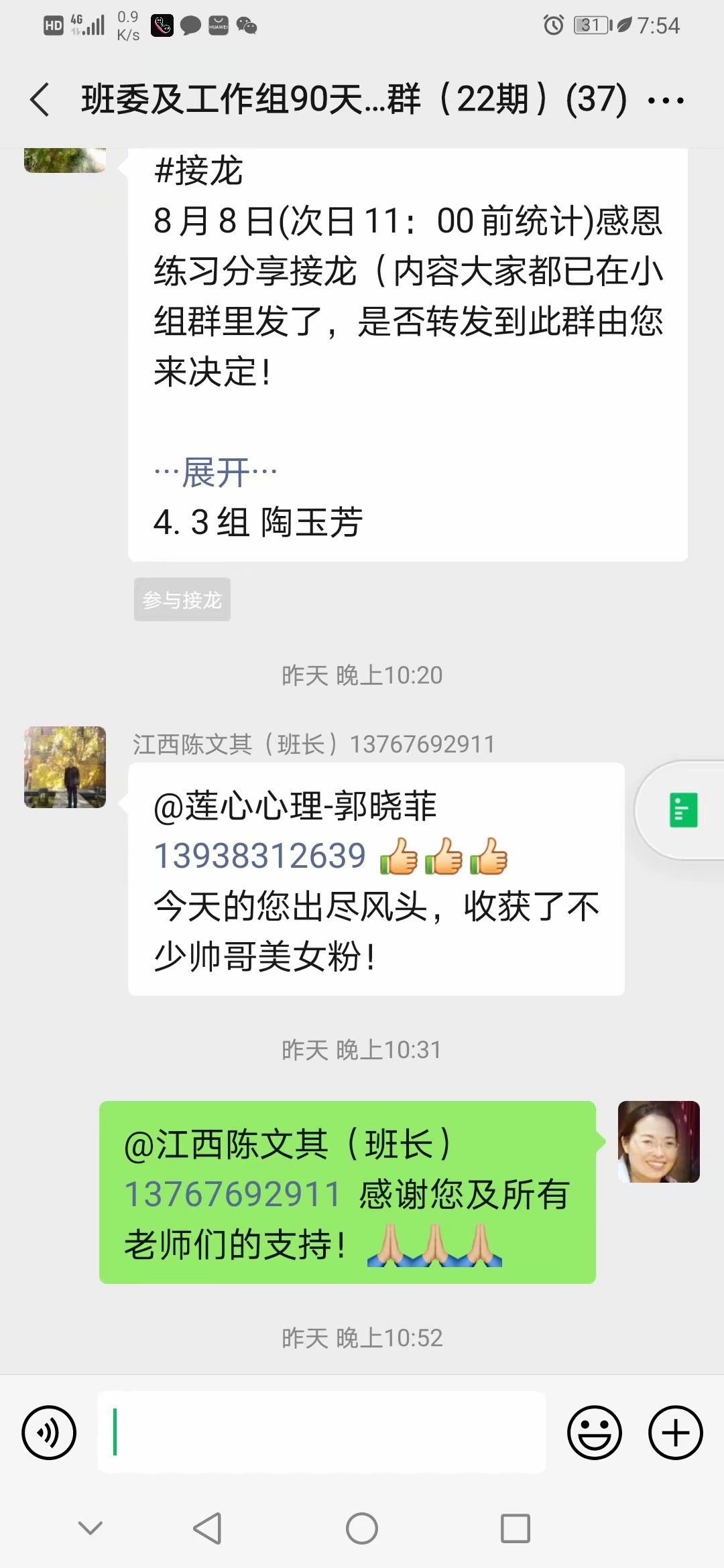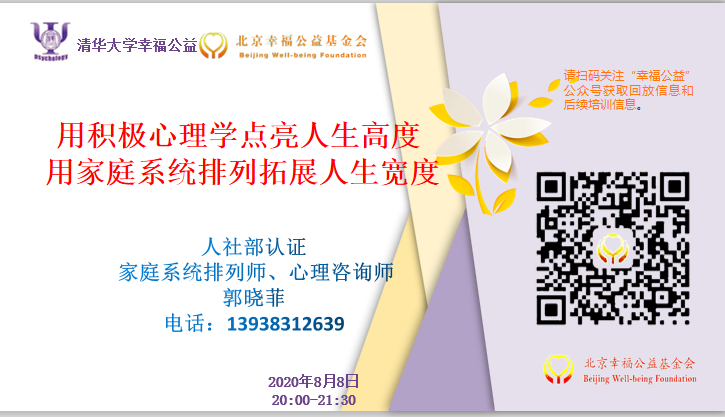 2020年8月8日第22期幸福园丁第六次班会上,践行指导员郭晓菲老师根据自己十五年的心理咨询经验,从心理咨询师的角度对积极心理学和家庭系统排列心理成长技术进行来精辟解读,即:用积极心理学点亮人生高度,用家庭系统排列拓展人生宽度。