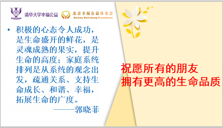 积极心理学和家庭系统排列是可以操作服务教育、医疗、心理咨询等行业中,因为它们告诉人们:中国传统文化的精髓瑰宝是疗愈心灵的根基。