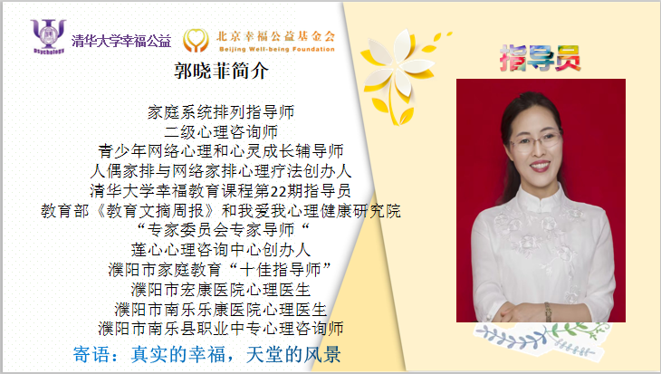 积极心理学和家庭系统排列都非常适合学校教育、课堂管理,心理咨询、或心理治疗中,让我们的教育教学工作变得得心应手、轻松自如。国家人社部认证排列师、心理咨询师郭晓菲老师在家庭系统排列的基础上于2013、2014年分别发明来人偶家排、网络家排心理咨询技术,之后她把积极心理学和她的这些创作柔和在一起,帮助来访者自己在个案场域中体验、感受、疗愈,进一步提升了咨询效果。由于篇幅太长,具体操作方法将在以后有时间再谈。
